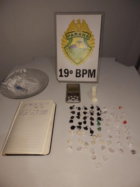 Durante as buscas pela moradia, no quarto do responsável pela residência, a equipe encontrou embaixo da cama, um prato de vidro com cocaína “em carreira” e uma nota de dois reais enrolada, pronto para uso.
