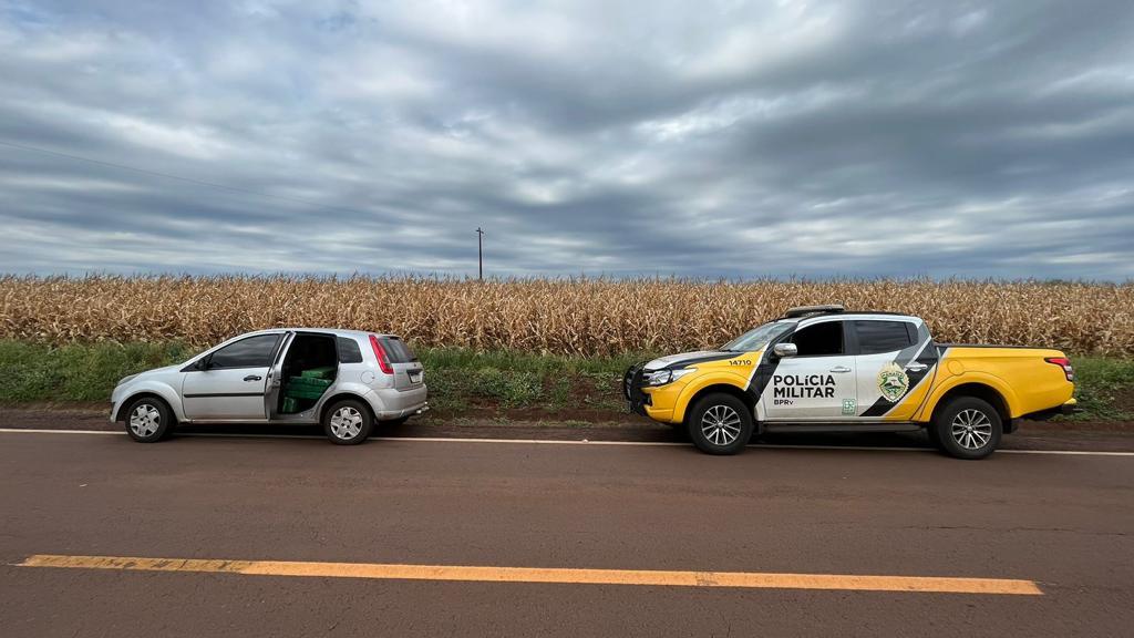 Hoje, as 11h15, a equipe da Poícia Rodoviária Estadual, estava realizando operação de fiscalização na Rodovia Estadual de prefixo PR 317, município de São José das Palmeiras, quando foi dado ordem de parada para o condutor do veículo Ford Fiesta com placas do Mercosul do município de Iracemápolis/SP, sendo que o condutor não obedeceu a ordem de parada e empreendeu fuga.