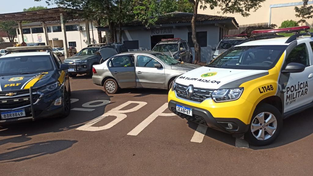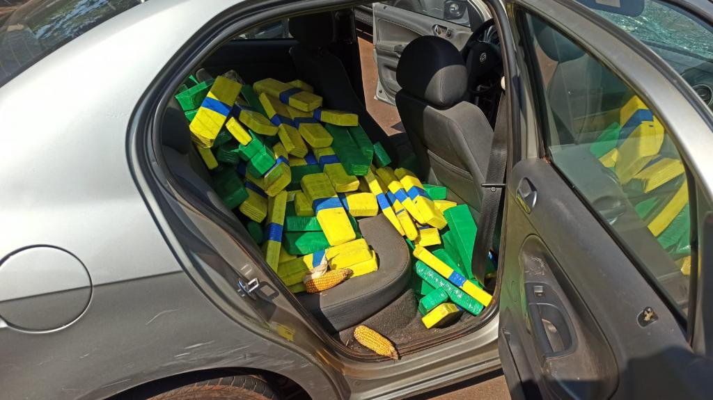 Durante a fuga da Polícia Militar e Polícia Rodoviária Federal o condutor abandonou o carro em meio a uma plantação de milho e desapareceu, segundo o que informou a polícia.