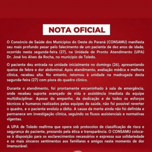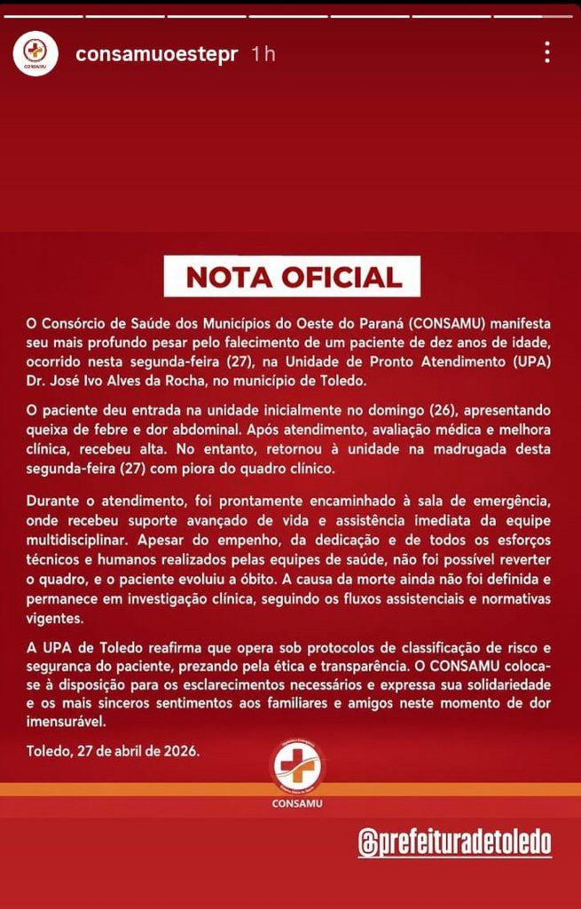 De acordo com nota oficial divulgada pelo Consórcio de Saúde dos Municípios do Oeste do Paraná (CONSAMU), a criança havia dado entrada inicialmente no domingo (26), apresentando febre e dor abdominal. Após passar por avaliação médica e apresentar melhora no quadro clínico, recebeu alta.