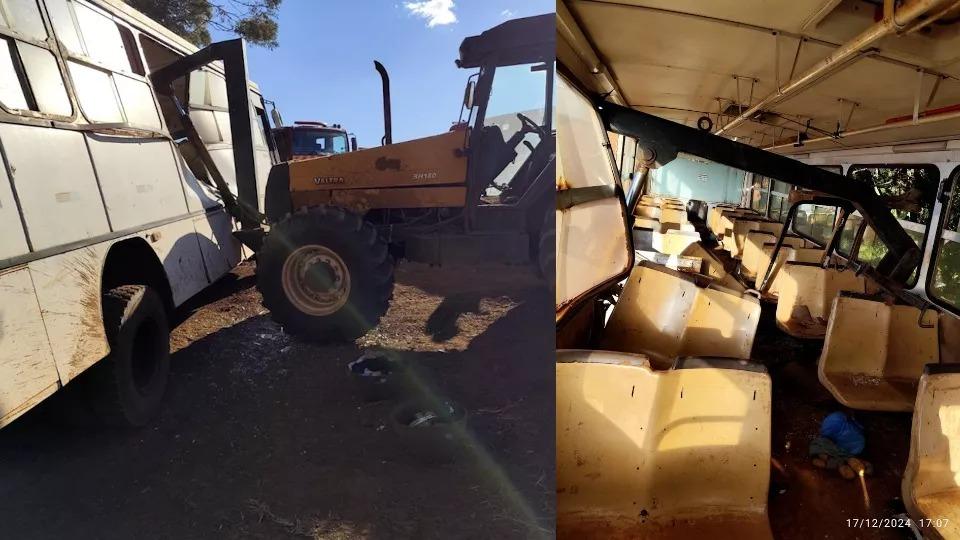 Um trator bateu e emperrou o braço mecânico contra a lateral de um ônibus no distrito de Palmeirinha, em Guarapuava, no centro-sul do Paraná, na tarde desta terça-feira (17). O acidente foi às 16h05 na área de uma fazenda de plantação de batatas.