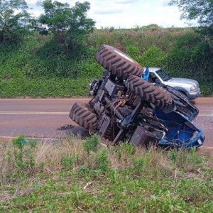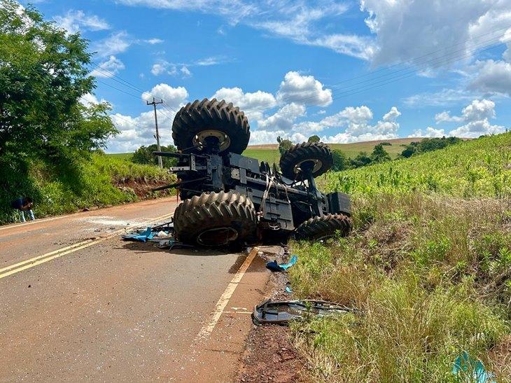 Um trator recém-comprado, que estava sendo transportado ao comprador em um caminhão, caiu da prancha na PR-566, trecho que liga o Distrito de Vista Alegre, em Coronel Vivida, a Itapejara D’Oeste – municípios do sudoeste do Estado.