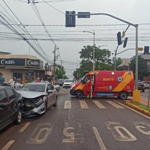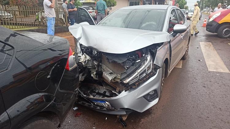 Os carros trafegavam pela Avenida em sentidos opostos e no cruzamento que é controlado por semáforo a motorista do Honda fez uma conversão à esquerda e houve a colisão, um Ford Fiesta que estava estacionado também foi atingido.