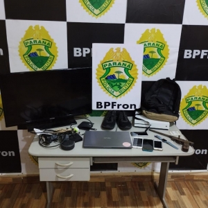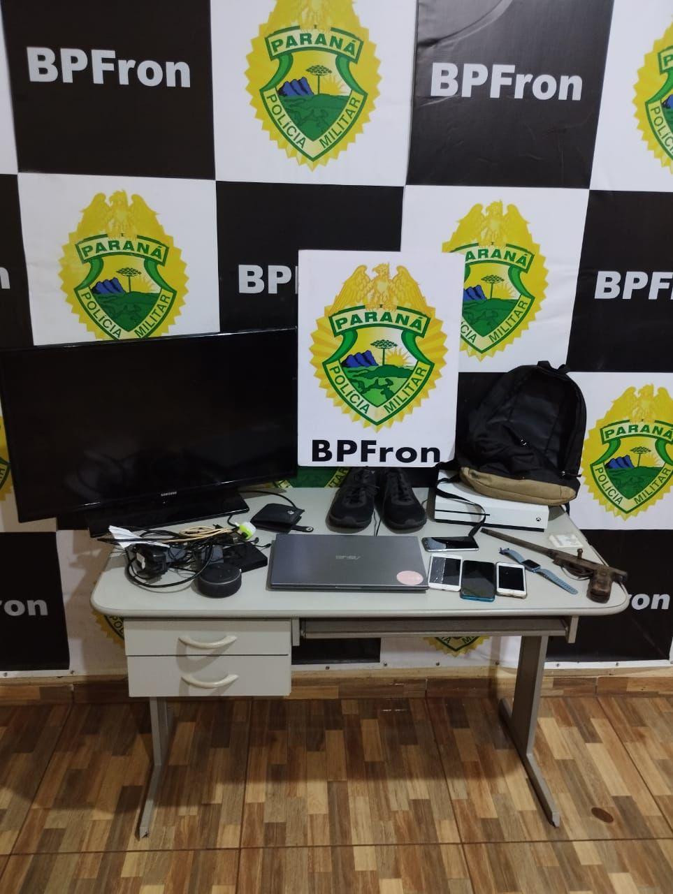 Com os abordados e no veiculo, foram encontrados diversos objetos como celulares, tv, vídeo game, notebook, Smart Watch, dinheiro, calçado, mochila, tudo proveniente do roubo na cidade vizinha, bem como uma arma de fogo artesanal utilizada para cometer o crime.