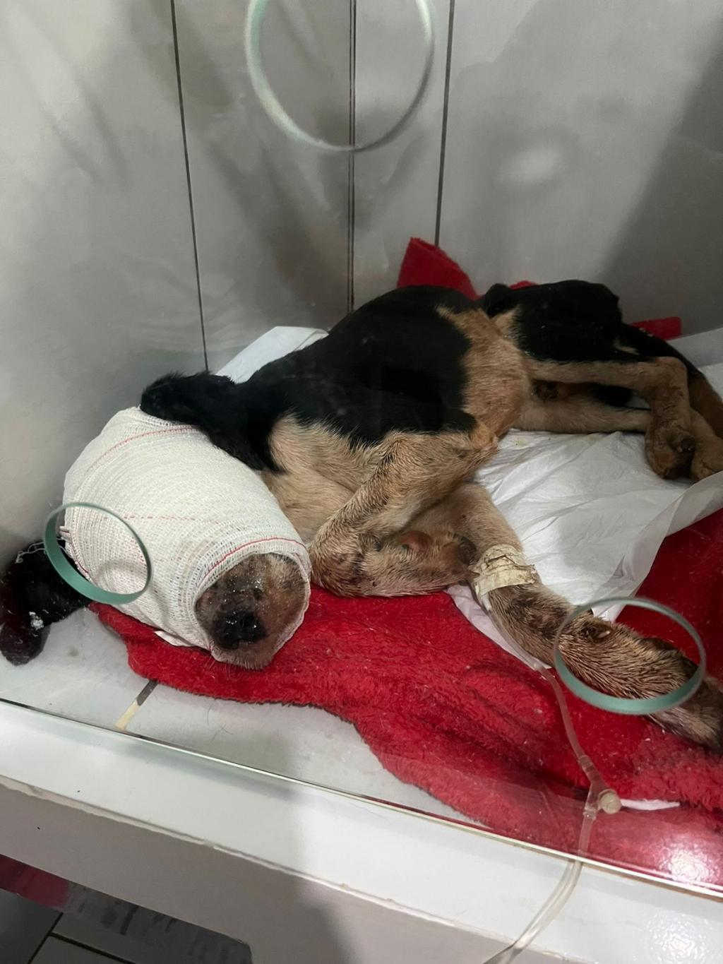 O cão estava com uma ferida enorme na região dos olhos, segundo imagens divulgadas, dá para ver boa parte do crânio, moscas e bichos tornavam o ferimento ainda mais grave.