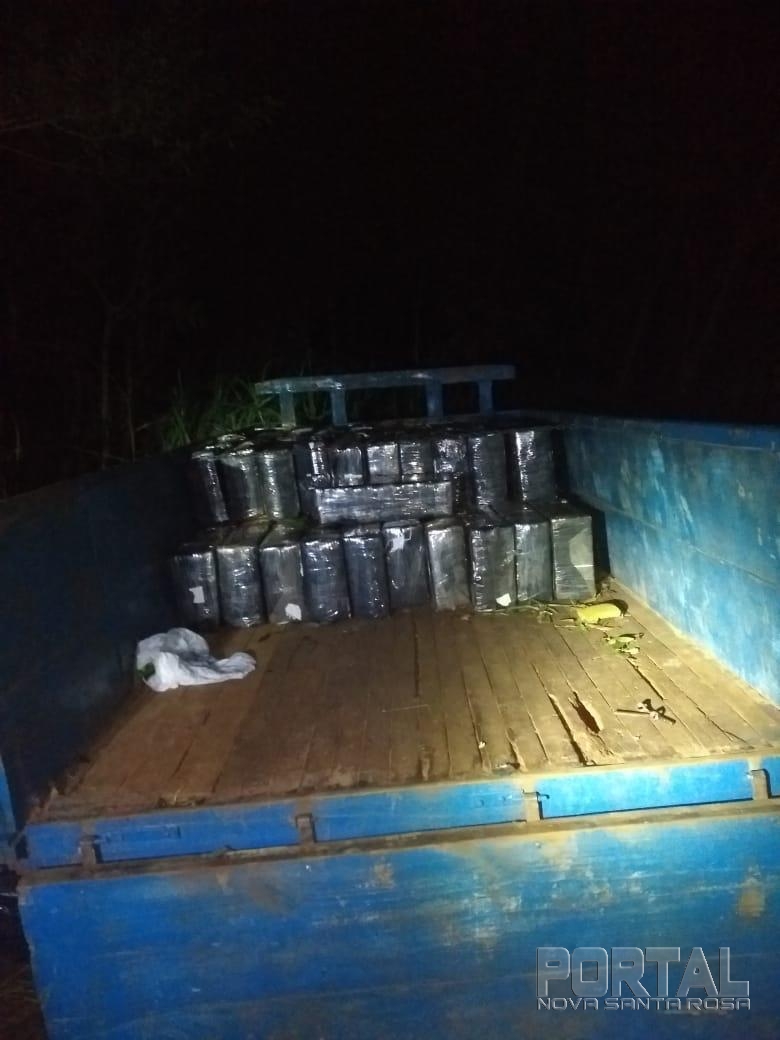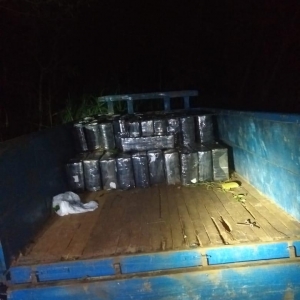 Realizando as buscas no local os policiais encontraram um acampamento improvisado e uma carreta de trator, contendo 71 fardos de substâncias análogas à maconha que pesaram 1.005,570 Kg (um mil e cinco quilos e quinhentos e setenta quilogramas), ainda dentro do acampamento foram encontradas 13 caixas de cigarros e 14 volumes de essência de narguilé.