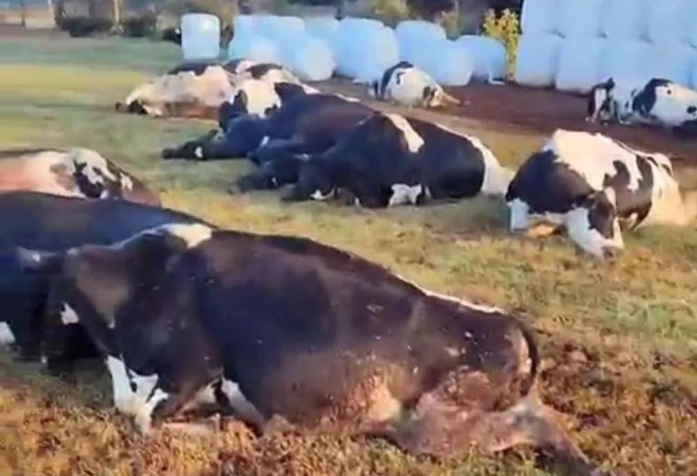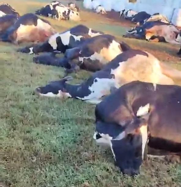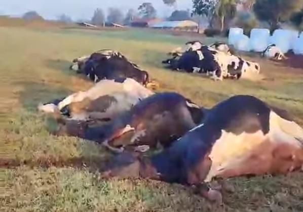 Imagens registradas ao longo desta terça-feira (08) mostram a triste cena na propriedade, evidenciando a gravidade do ocorrido. Técnicos e profissionais da área agropecuária estiveram no local para avaliar os danos e orientar sobre medidas preventivas.