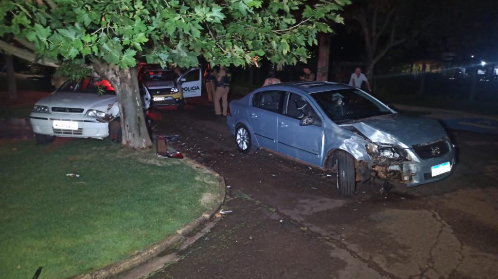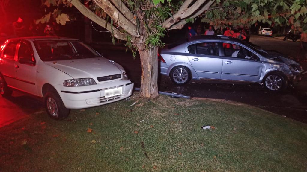 A colisão foi na traseira do Palio, que foi jogado contra uma árvore.
