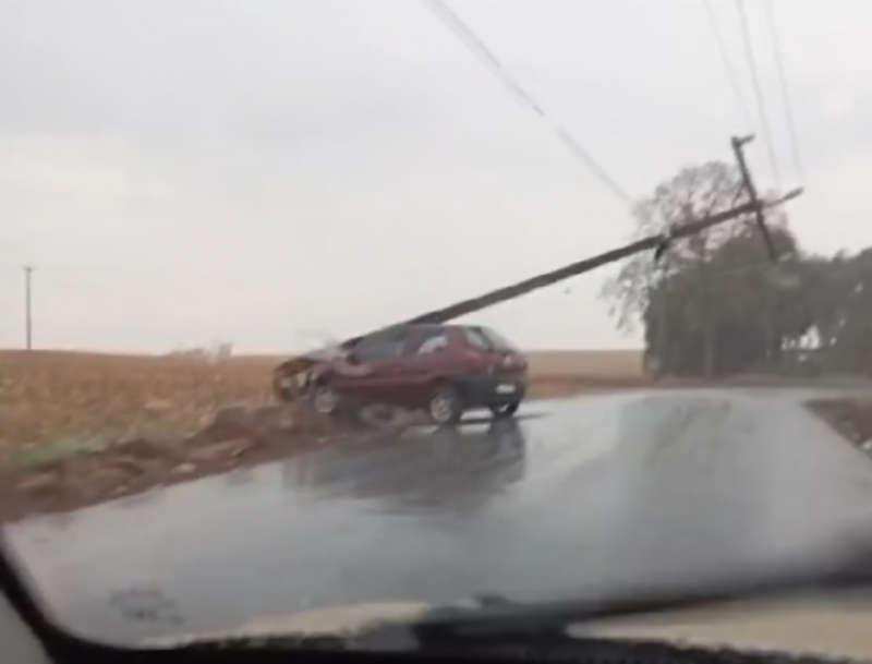 Segundo relatos, um veículo Fiat Palio acabou colidindo e quebrando um poste de energia, que caiu sobre o veículo.
