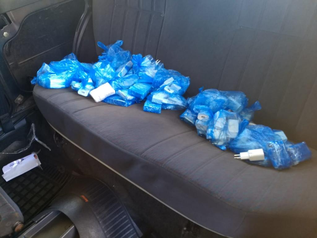Durante a fiscalização foi localizado sob o forro das laterais do veículo 100 aparelhos de celulares de diversas marcas além de carregadores para aparelhos celulares.