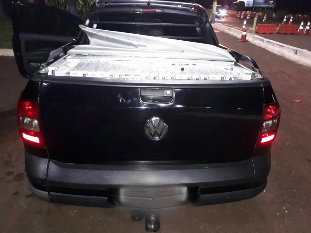 Ao realizar a identificação veicular foi constatado que a VW Saveiro ostentava placas falsas, porém não havia ocorrência de roubo ou furto do veículo e o CRLV verdadeiro foi localizado no interior do veículo. Durante a fiscalização ficou constatado ainda que o veículo estava carregado com cigarros de origem paraguaia na caçamba e em seu interior.
