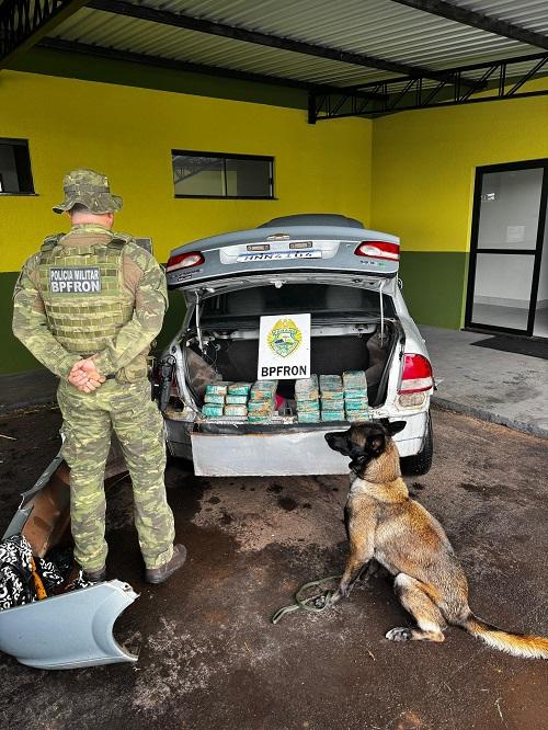 Através de patrulhamento, os agentes abordaram um veículo GM/Corsa, com o motorista do veículo, um homem de 28 anos, nada de ilícito foi encontrado, já na busca veicular, com apoio da equipe Canil e o emprego do cão de faro Nero, o qual acusou positivamente à presença de drogas no para-choque traseiro, constatou-se o mesmo estar com 18,6 quilos de crack em um compartimento oculto.
