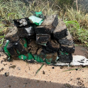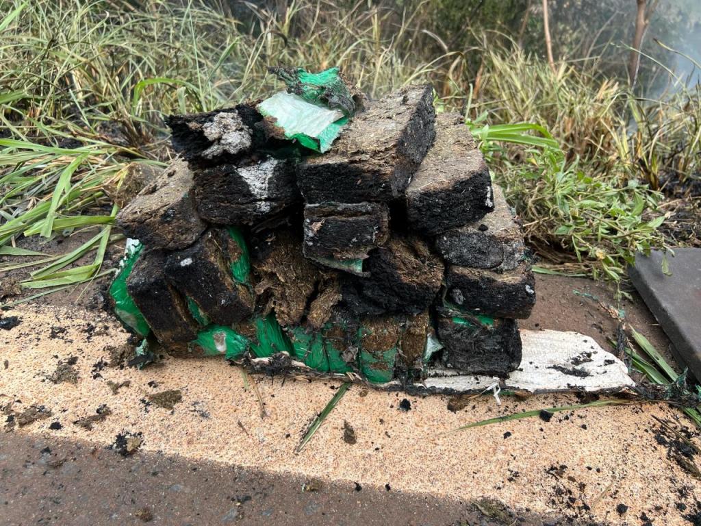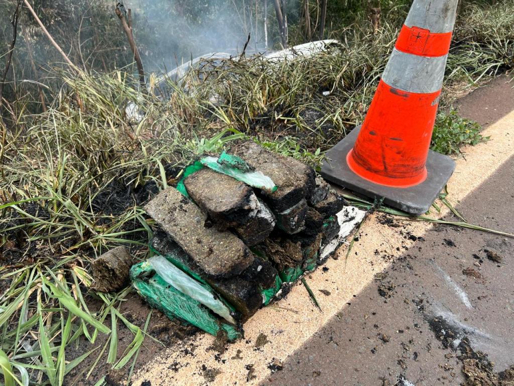 Militares do Corpo de Bombeiros e Defesa Civil foram acionados para realizarem o rescaldo do fogo no veículo e que atingiu a vegetação ao redor. Veículo e droga foram removidos.