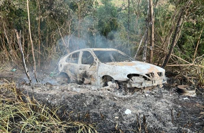 No local, foi possível constatar que um veículo Renault Megane Hatch, havia sido consumido totalmente pelo fogo após sair da pista e descer um barranco.