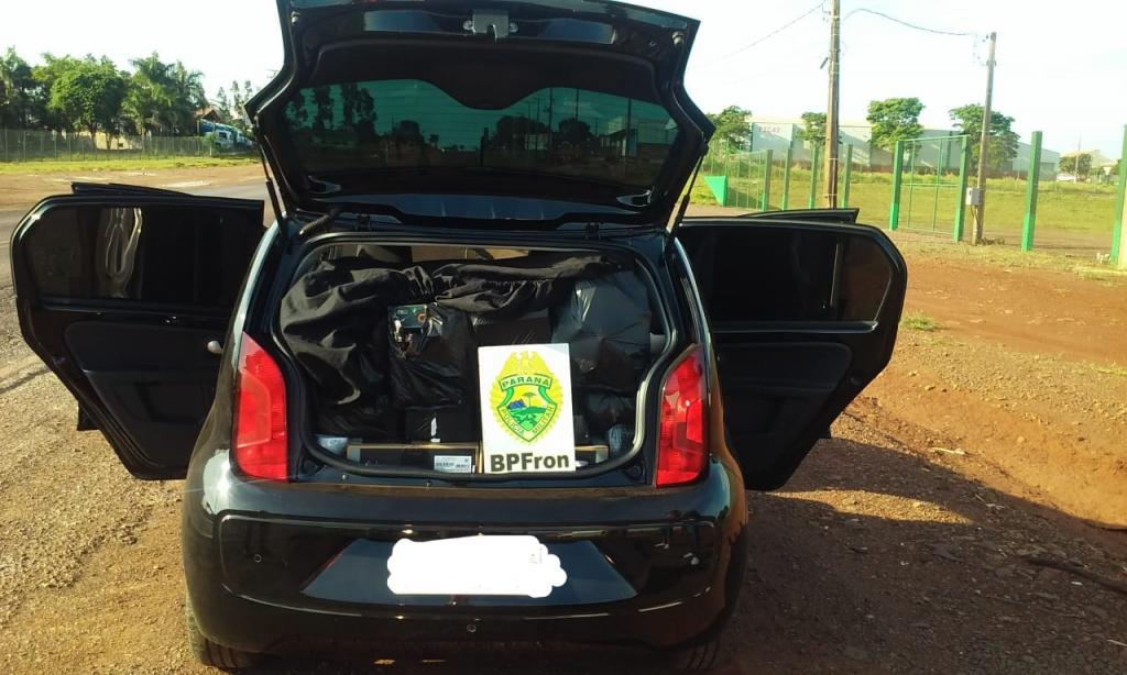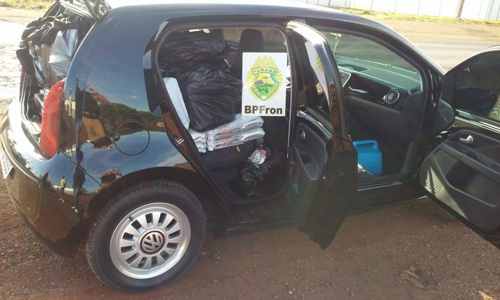 Em dado momento um veículo VW/Up de cor preto foi abordado. Foi realizado revista veicular onde foi constatado que o veículo estava carregado com produtos oriundos do Paraguai sem o devido desembaraço aduaneiro.