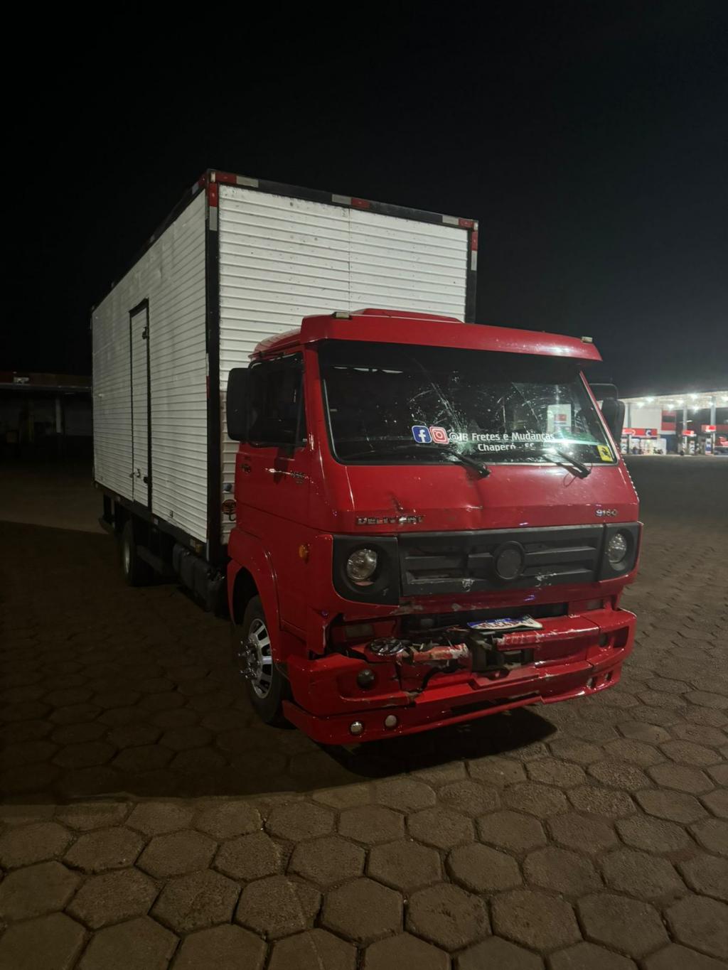 A PRE atendeu a ocorrência, o reboque do Ford atingiu a frente do caminhão.