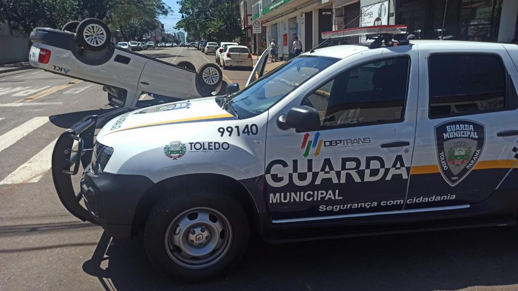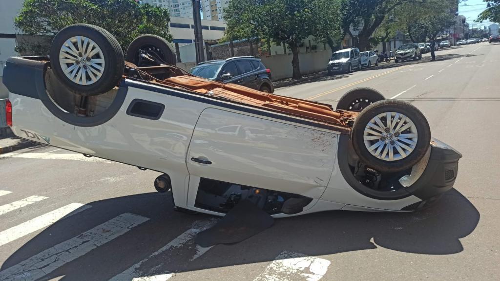 Um capotamento aconteceu no início da tarde desta terça-feira no cruzamento da rua Piratini com rua Santos Dumont no centro de Toledo e envolveu um veículo BMW um utilitário Volkswagen Saveiro, os dois com placas Mercosul.