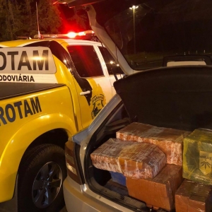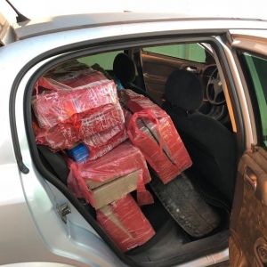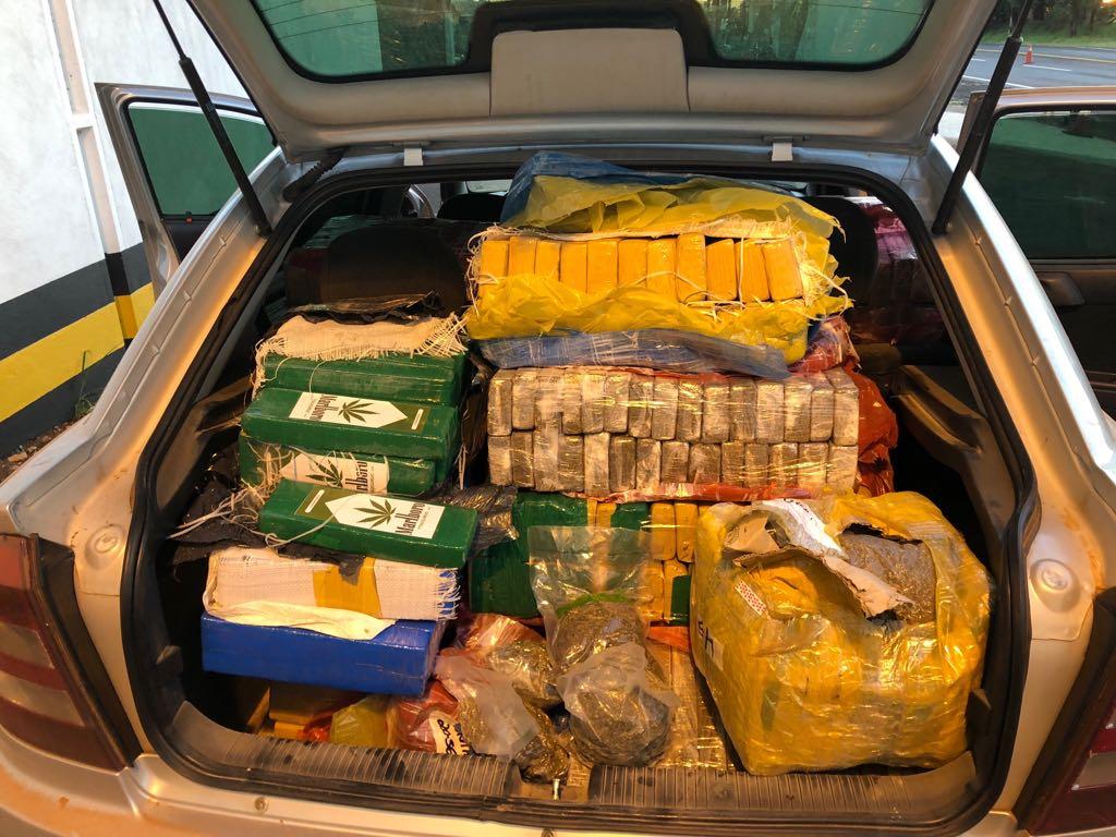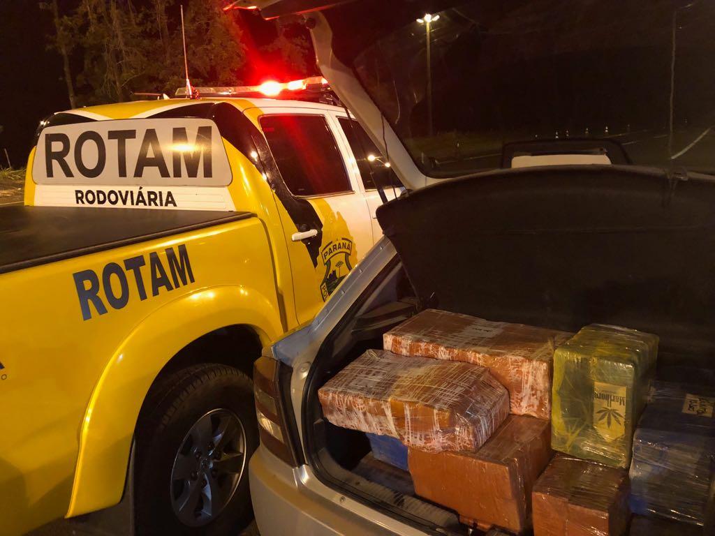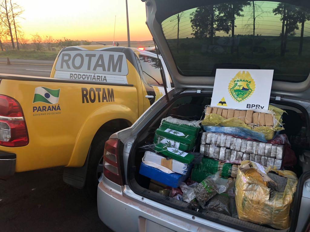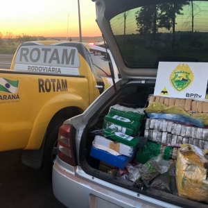 Por volta das 05h00 da manhã de hoje (23), em operação de fiscalização na PR-323, município de Cafezal do Sul, foi realizada a abordagem do automóvel GM/Astra, de cor prata, licenciado no município de São Paulo–SP. Sendo que de imediato já foi visualizado pela equipe de serviço, sobre o banco traseiro e no bagageiro do veículo alguns volumes envoltos em fita adesiva, onde foi constatado se tratar de maconha.