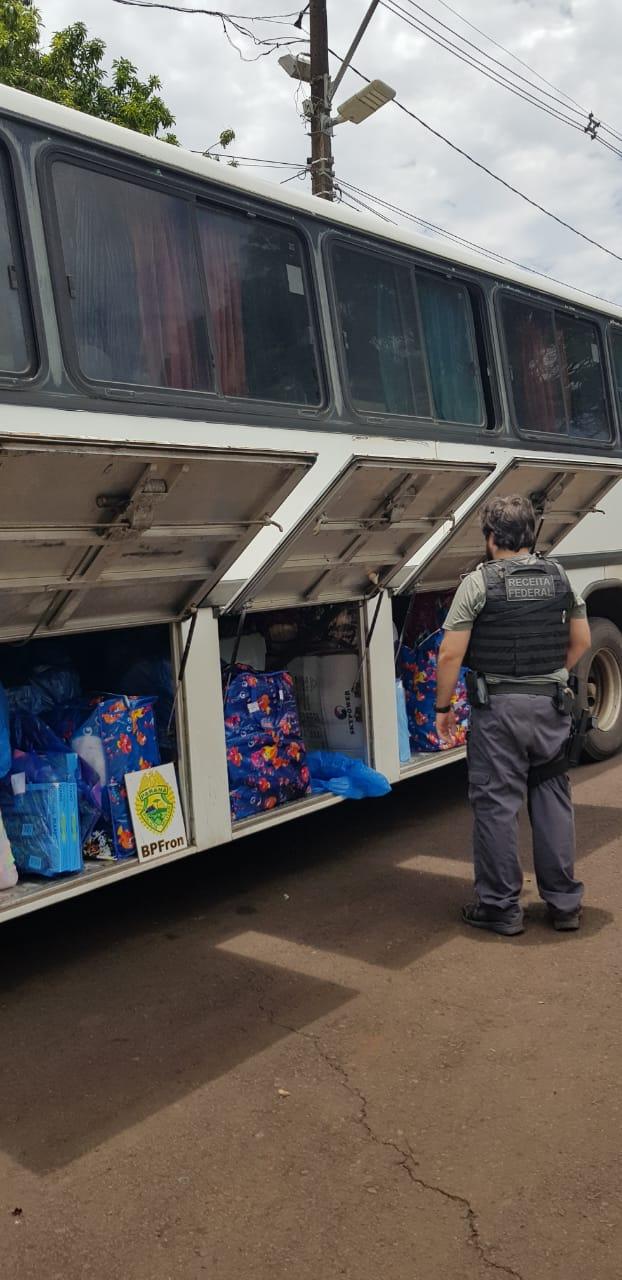 As ações de fiscalização resultaram na apreensão de 02 (dois) ônibus de turismo e um veículo NISSAN/Livina de cor prata carregados com mercadorias de origem estrangeira sem o devido desembaraço aduaneiro.
