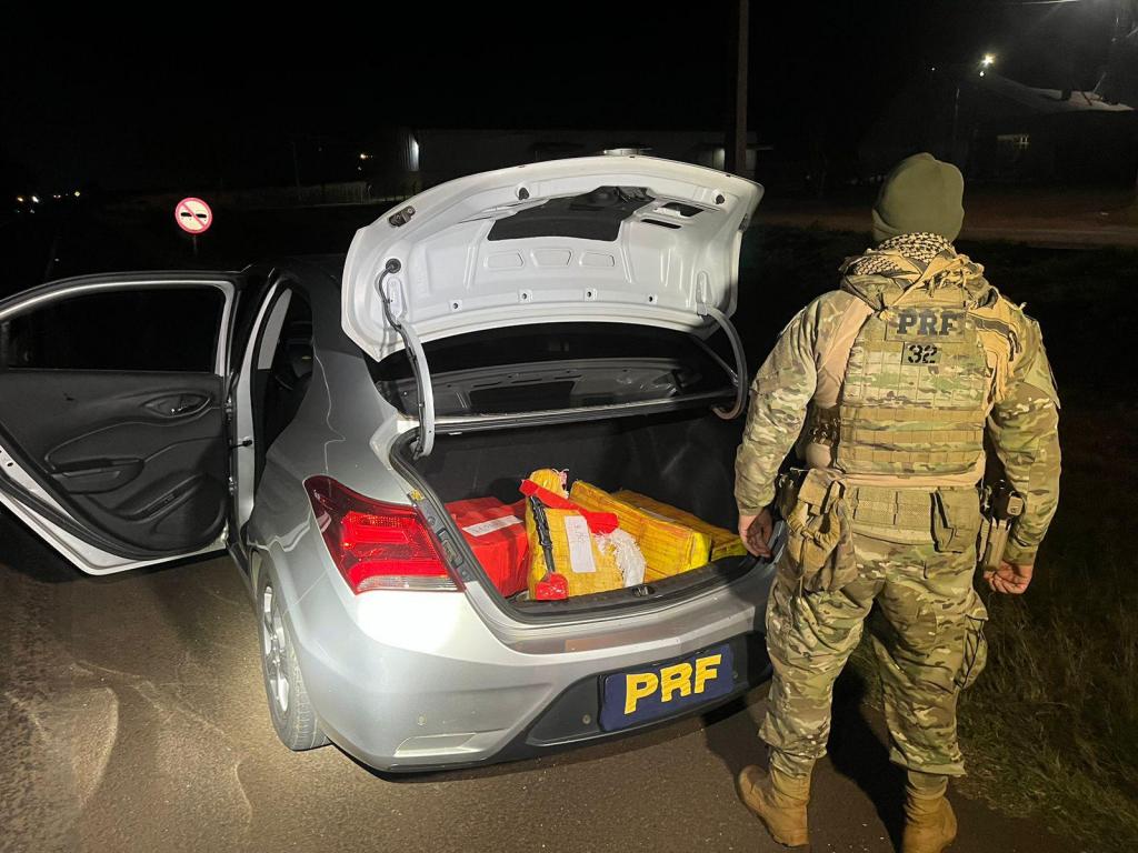 Praticamente no mesmo horário, um outro veículo foi abordado próximo ao pedágio de Céu Azul. O condutor foi flagrado em um Prisma transportando 247 kg de maconha. Ele foi preso em flagrante.