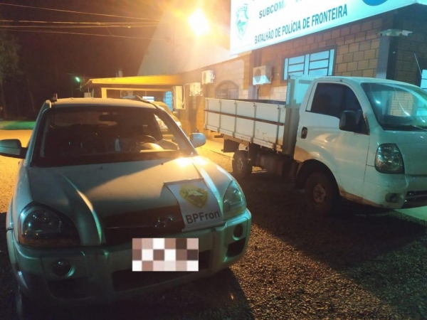 Na garagem haviam dois veículos um Tucson/Hyundai placas de origem paraguaia de cor prata que ao ser consultado via sistema policial foi constatado que sua verdadeira placa possui queixa de furto/roubo desde o dia 05 de maio deste ano na cidade de Joinville /SC, na mesma garagem foi encontrado um veículo Kia/Kongo de cor branca somente com placa frontal e ao verificar o número de chassi estava parcialmente suprimido com sinais de adulteração, em consulta ao número do motor confirmou ser o motor de outro veículo da mesma marca e modelo diferente do chassi e da placa que nele estavam, veículo esse que o homem relatou ser utilizado na prática de contrabando.