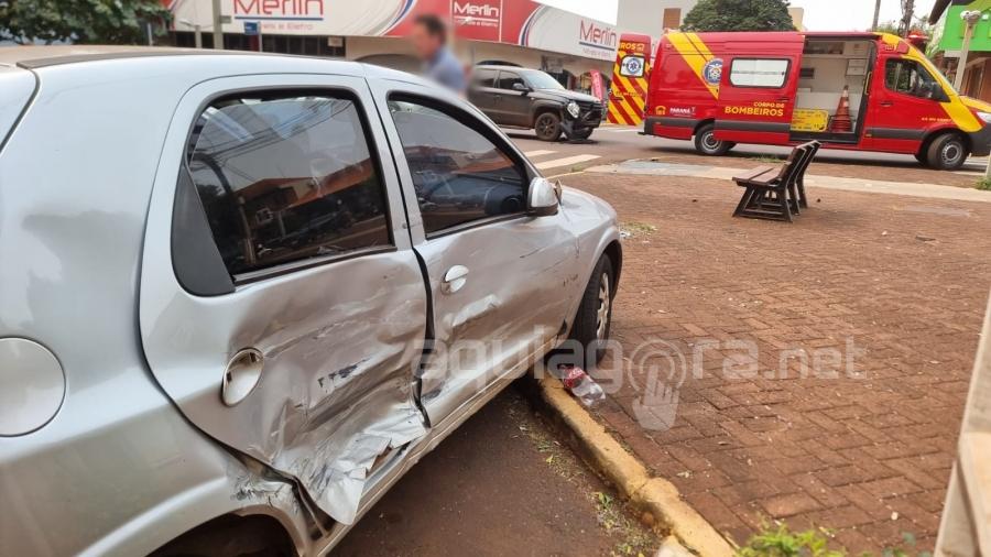 A violenta colisão ocorreu no cruzamento das ruas Paraná e 7 de Setembro, e envolveu dois carros, um Celta e uma caminhonete.