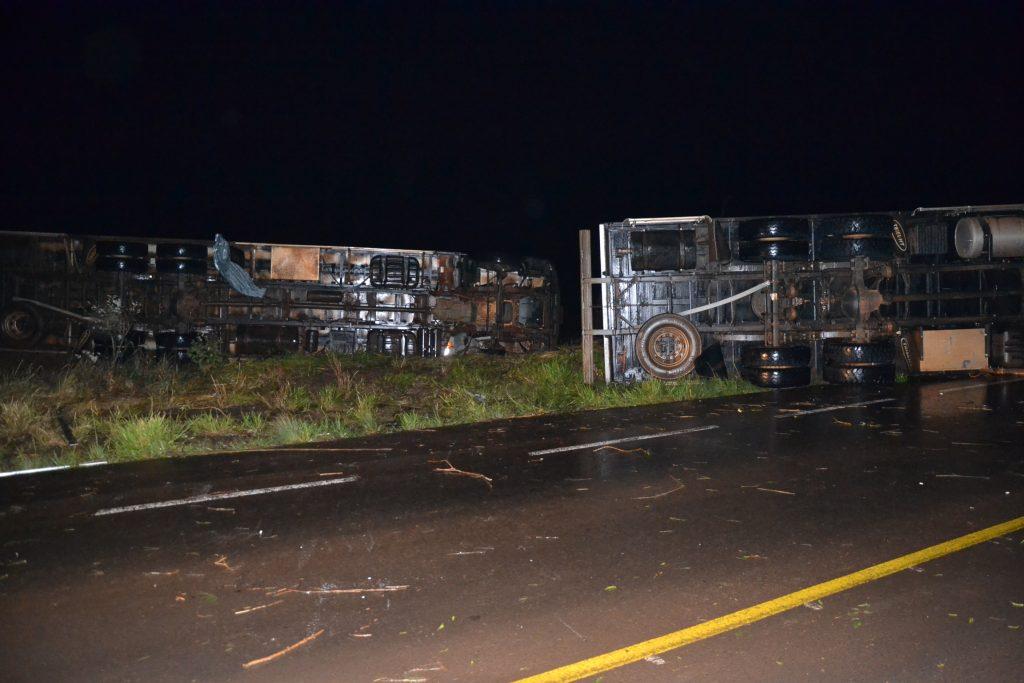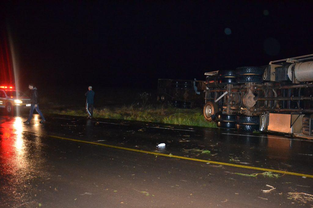 Os dois caminhões trafegavam sentido Rondinha/Sarandi quando perceberam o forte vento parando as margens da rodovia, quando foram tombados e arrastados pela força do vento, ambos possuem placas de Barão de Cotegipe/RS, e seguiam para carregar suínos, em ambos os veículos haviam o motorista e o passageiro que não se feriram, apenas um dos motoristas foi encaminhado para o Hospital Comunitário de Sarandi em estado de choque para receber atendimento.