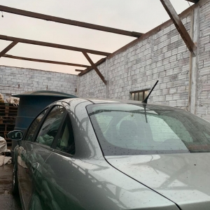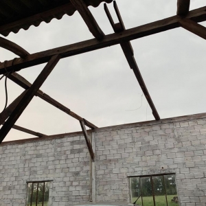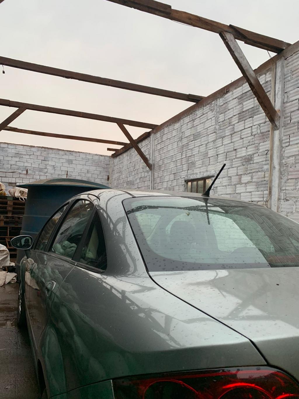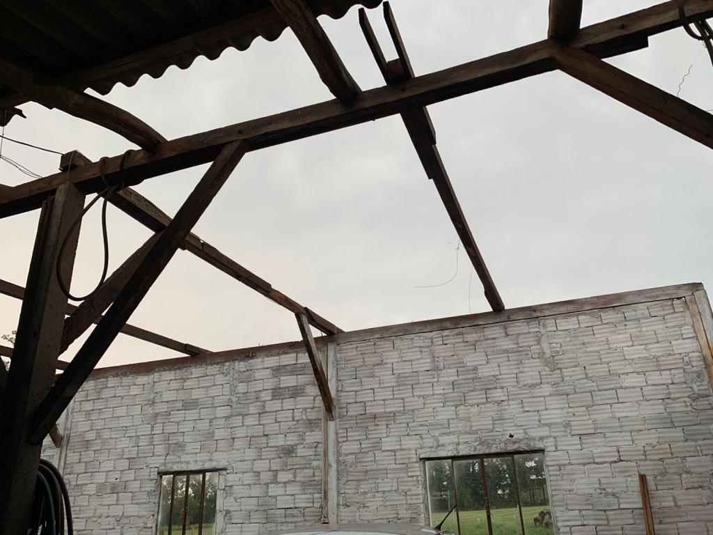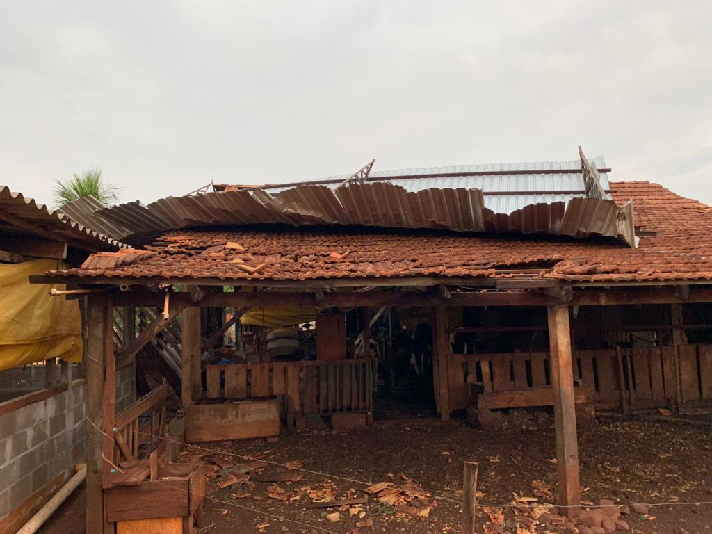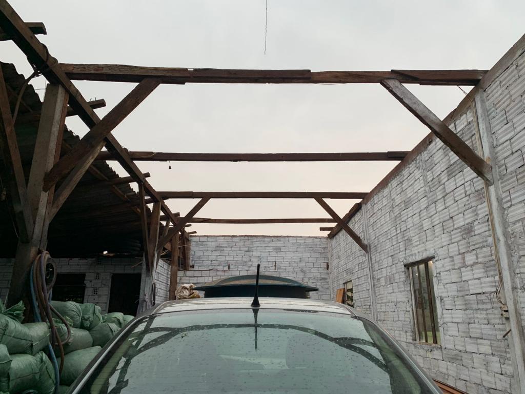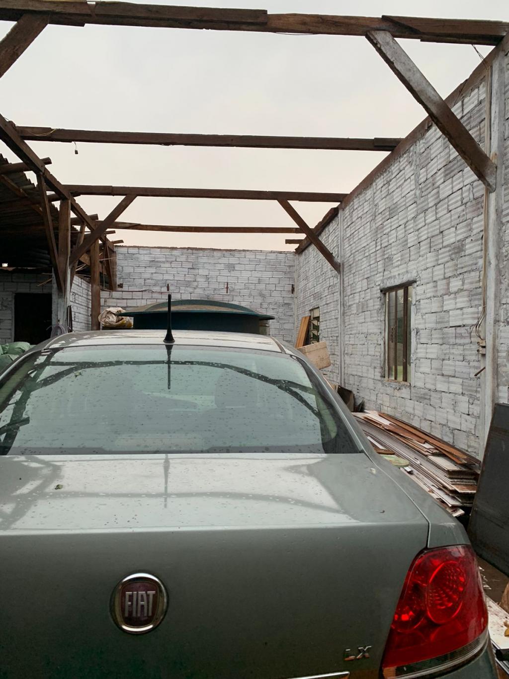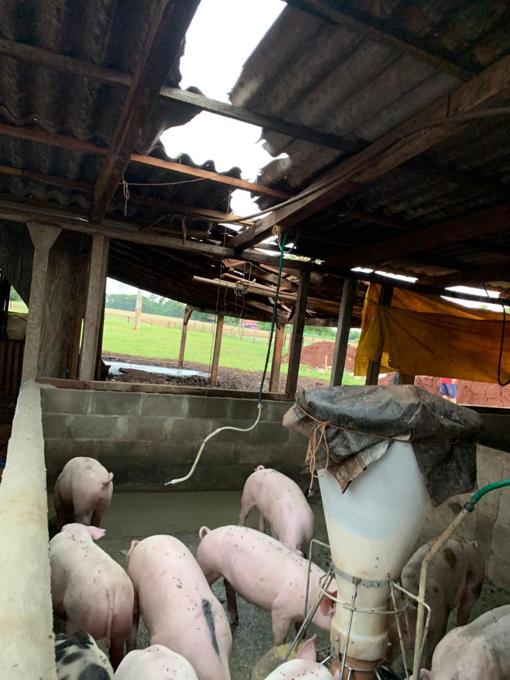 Por sorte o veículo que estava no barracão não foi afetado, parte do telhado do chiqueiro também foi destruído.