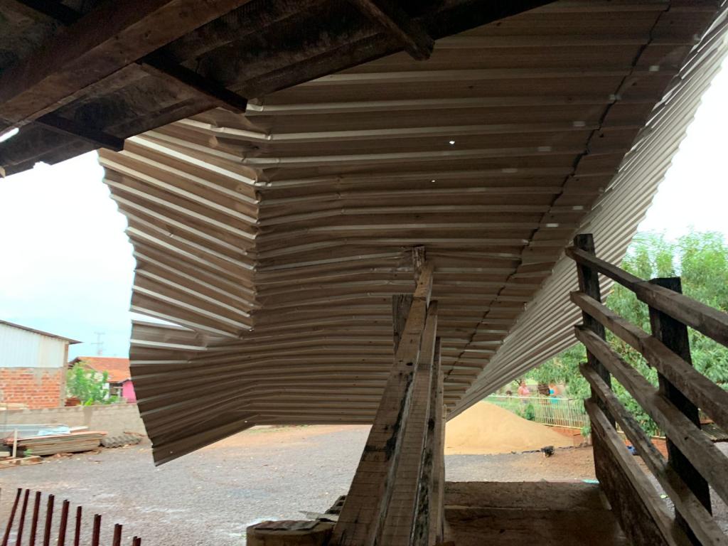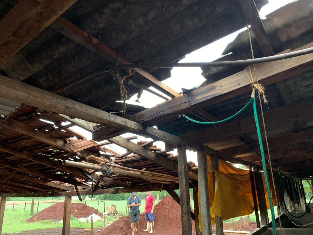 Silvio disse que foi ao mercado e quando iniciou a ventania resolveu ir para casa, quando chegou na propriedade se deparou com o telhado do barracão com a estrutura metálica jogado de lado em cima de um estábulo de vacas leiteiras, metade da cobertura caída na parte da frente.