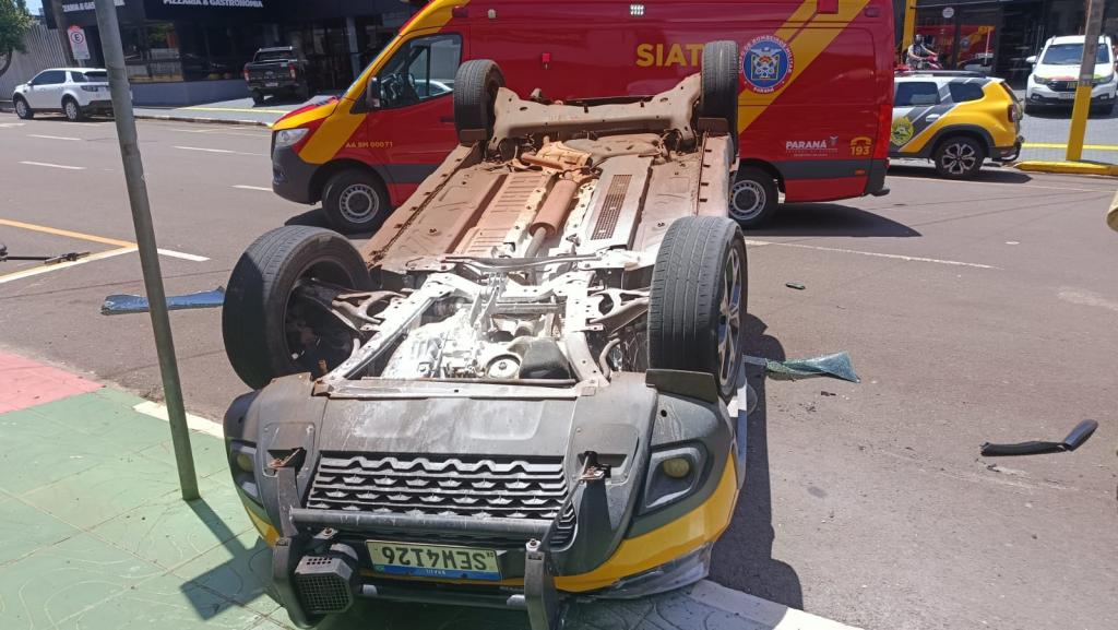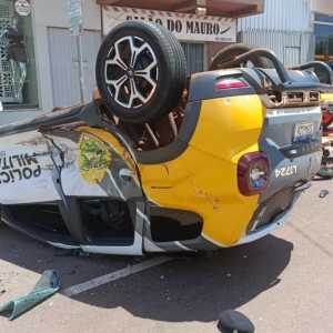 Um grave acidente mobilizou equipes de socorro nesta sexta-feira (24) em Toledo. A colisão, seguida de capotamento, envolveu uma viatura da Polícia Militar, uma caminhonete Ford F4000 e um patinete elétrico, na área central da cidade.