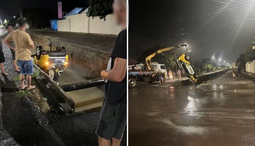 A Polícia Militar estava em perseguição a uma motocicleta, cujo piloto direcionou sua fuga em direção ao Lago Municipal. Durante a perseguição, em uma via estreita, um dos policiais perdeu o controle da direção e a viatura acabou capotando e caindo em um córrego.