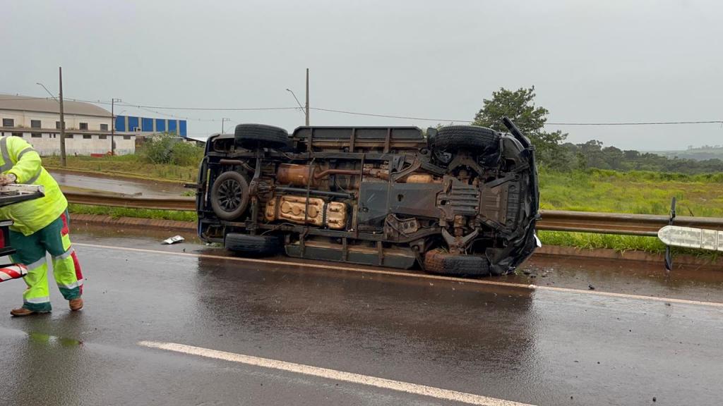 Uma viatura da Polícia Penal do Paraná se envolveu em um acidente no quilômetro 482 da BR-369, em Corbélia, durante a tarde desta sexta-feira (12). O veículo, uma caminhonete S10, seguia em deslocamento operacional quando acabou capotando e parando de lado na rodovia, ficando bastante danificado.