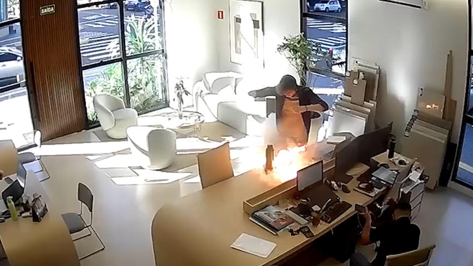 A equipe de reportagem teve acesso ao vídeo que mostra o celular pegando fogo. Na imagem é possível observar o Lucas Maldaner, estagiário da empresa, sentado na mesa no que era para ser mais um dia comum de trabalho. "Eu cheguei lá coloquei pra carregar, como tinha feito quarta-feira, a mesma coisa", conta o jovem.