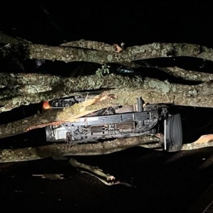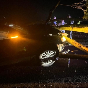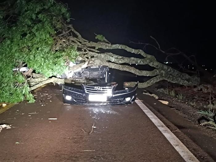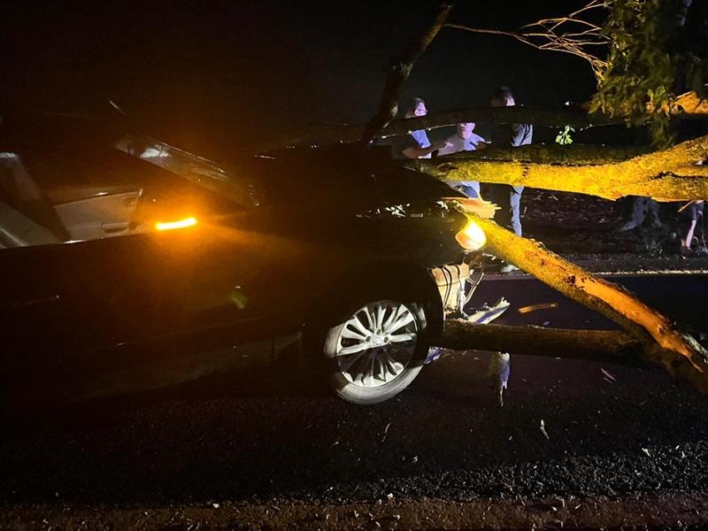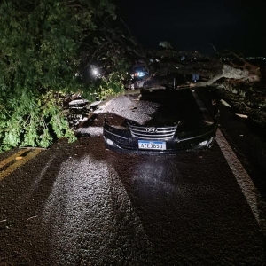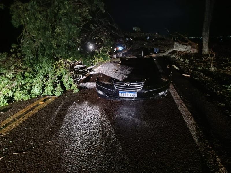 Um grave acidente foi registrado no início da noite deste sábado (20) na rodovia estadual PR-591, entre Vila Nova e Novo Sarandi em Toledo. Um veículo Hyundai Azera preto, de Toledo colidiu contra uma árvore de grande porte que havia caído sobre a pista durante a chuva forte.