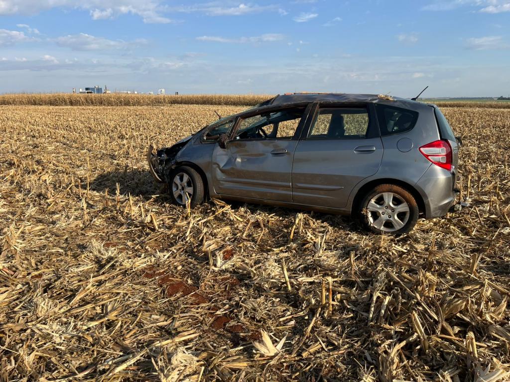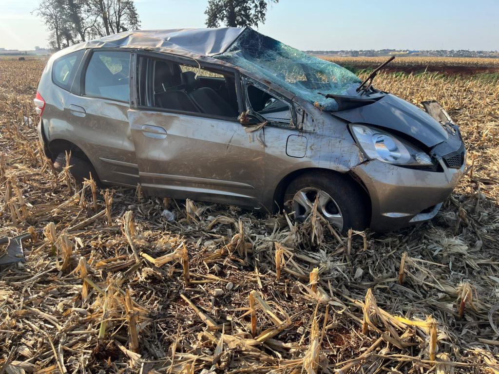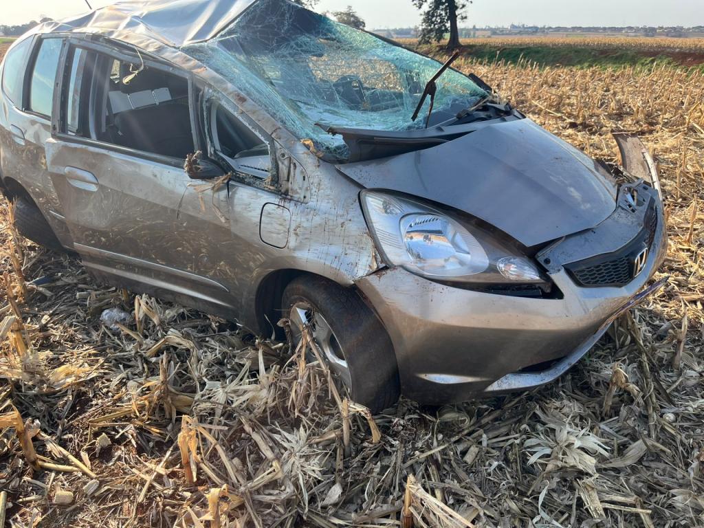 O carro então subiu um barranco e entrou em uma lavoura, onde acabou capotando por alguns metros, parando na posição normal. O carro ficou destruído.