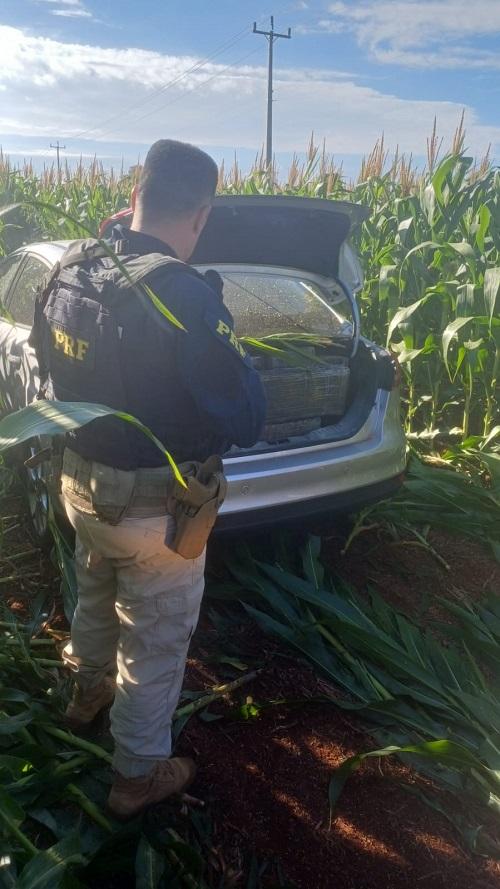 Durante a fuga, o veículo apresentou uma possível pane mecânica. O motorista, então, entrou com o carro em uma plantação de milho e o abandonou, fugindo a pé em meio à lavoura. A equipe realizou buscas na região, mas o condutor não foi localizado até o momento.
