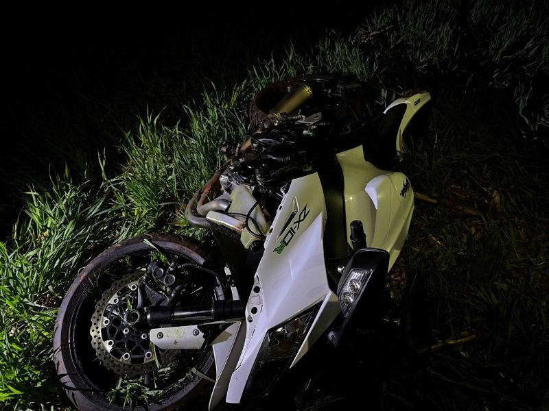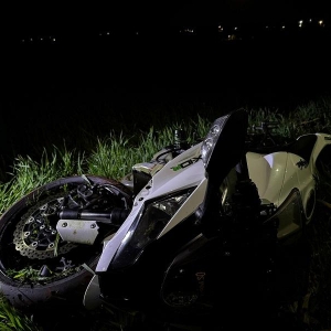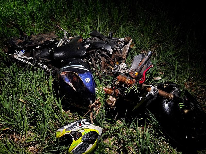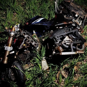 O segundo motociclista também deixou a pista, mas não se feriu. A Suzuki de alta cilindrada que ele conduzia ficou completamente destruída, com o motor e a estrutura rompidos ao meio, tornando o veículo irreconhecível.