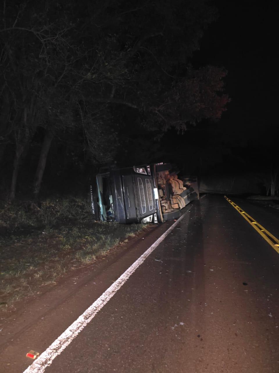 O caminhoneiro de 44 anos ficou ferido na noite desta quinta-feira após o caminhão Trator/Volvo FH 540, placas de Sarandi, Paraná, tracionando o conjunto de semi reboques Noma tombar na rodovia estadual PR- 180, sentido Cafelândia a Nova Aurora.